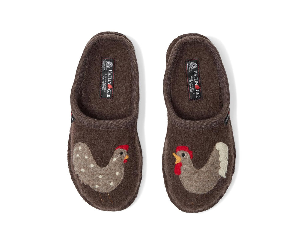 These Haflinger® Chicken slippers are sure to become your new favorites. So much fun to wear with a matching novelty design on each foot. Their 100% boiled wool upper and lining are not only super soft and cozy, but their natural fiber will keep your feet at a constant temperature by wicking away the moisture while acting as a natural insulator. This means keeping you warm in cold weather and cool in warm weather. The latex-molded midsole provides arch support for comfort where you need it most. These slip-on shoes are made of a wool insole that offers arch support. The rubber outsole is double-felted to give you some extra cushioning and durability. Breathable and durable, these adorable slippers are styled with a chicken detail on the upper for an eye-catching appeal.