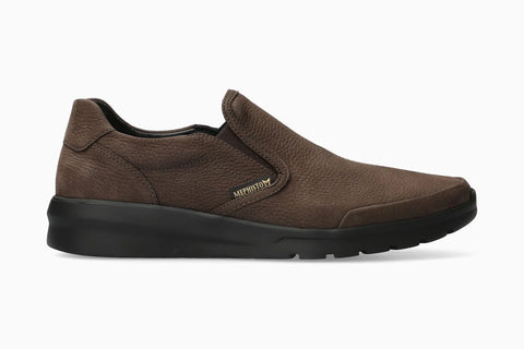 A very comfortable slip-on with a casual chic look. The SHOCK-ABSORBER in the outsole, combined with the removable insole featuring SOFT-AIR Technology, help to absorb the shocks inherent in walking. AIR-RELAX technology adjusts perfectly to the shape of the foot, providing perfect support. Elasticated instep straps allow easy entry and exit. This leather-lined shoe guarantees incomparable comfort and fit. This brown model for men is made from grained nubuck leather.