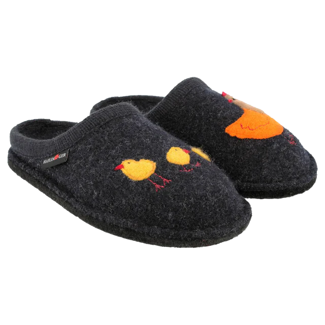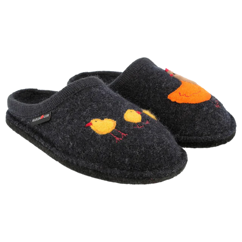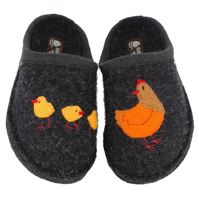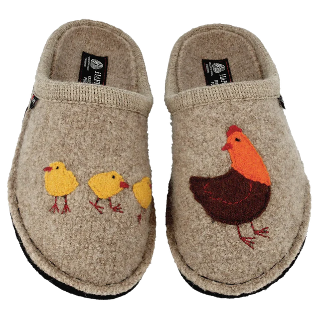 Combine comfort with a "chic-k" look in the Gallina slippers from Haflinger! The boiled wool upper and lining is not only soft and snug, but the natural fiber will keep your feet at a constant temperature by wicking away the moisture while acting as a natural insulator. That means keeping warm in cold weather, and cool in warm weather! The latex molded midsole provides structure and arch support for comfort where you need it most. The outsole is double-felted to give you some extra cushion with each step, and durability for long-time wear. After comforting those tired soles with all the comfort features, get some comfort for your "soul" as well with the cute adornment on the upper. The left and right slippers have a chicken and three of her baby chicks tagging along. Keep your feet cozy in the Haflinger Gallina slippers!